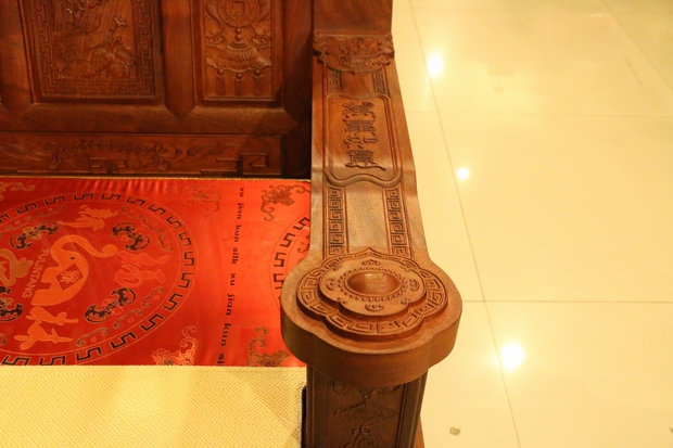 說完了背板,我們再來看看沙發(fā)的兩處扶手,在扶手上方的正中位置,雕繪有四個很清晰的字眼:萬事如意,字體仍是采用的古漢字字體,其筆畫彎延有致,筆鋒靈動飄逸,頗具藝術美感氣息,令人陶醉。而在其扶手末端之位置處,則是一分三層雕刻設計的立體紋飾圖案,用手輕撫摸之,層次立體感及舒適感十分明顯。另在扶手的外部側面處則還形象地雕繪有一框花籃,花籃內花團齊簇,顯得十分美艷,富貴華麗。